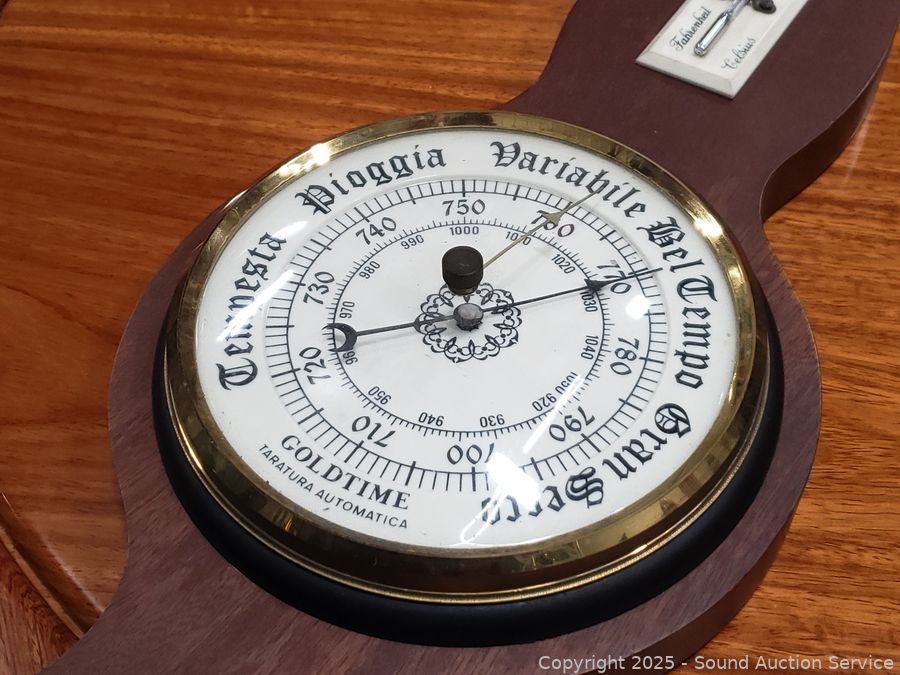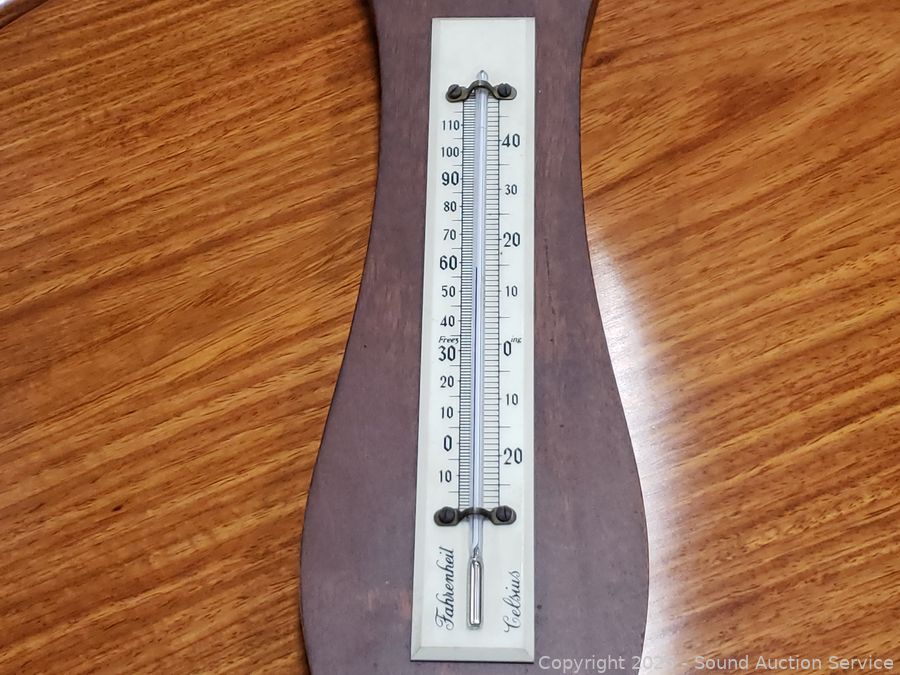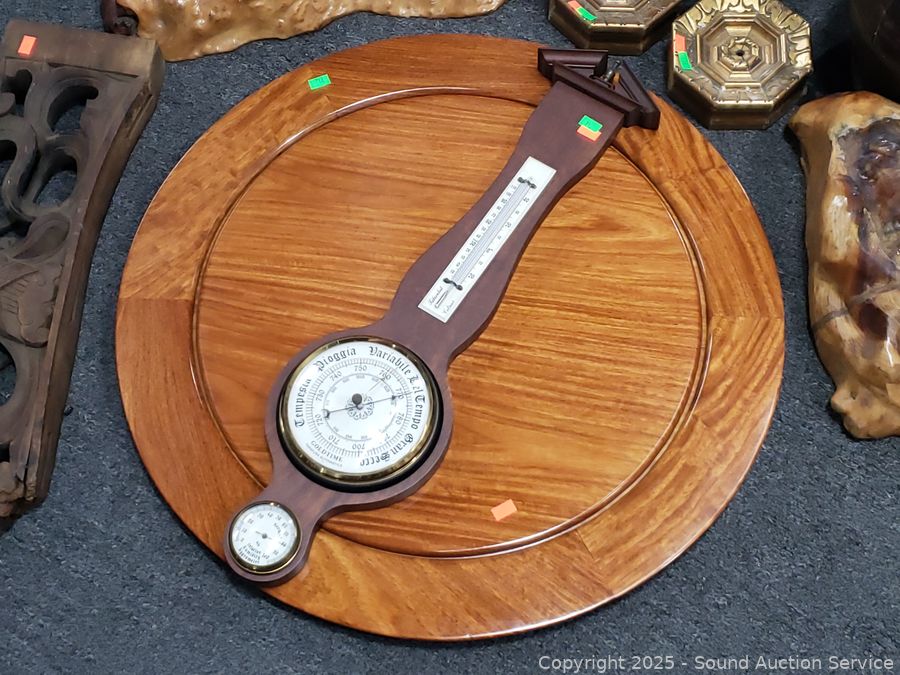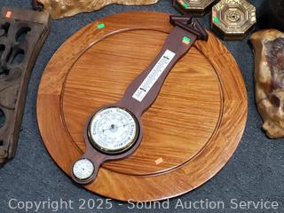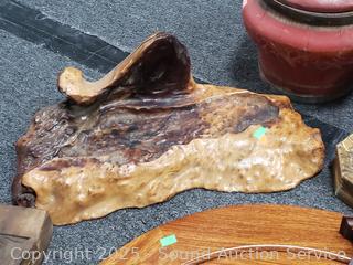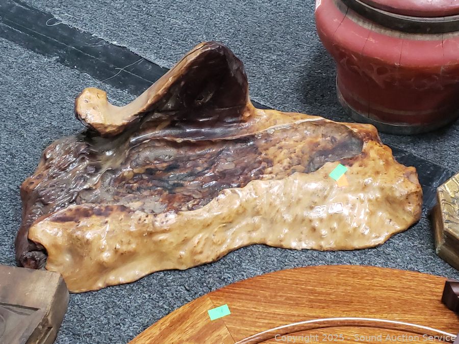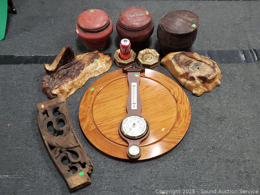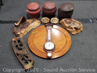 Olde Chinese wood vessels, weather station, carved wood board, burl wood pieces, 24" dia. polished piece of mahogany. Refer to photos for lot contents more details.