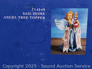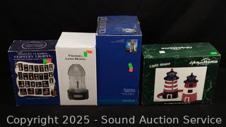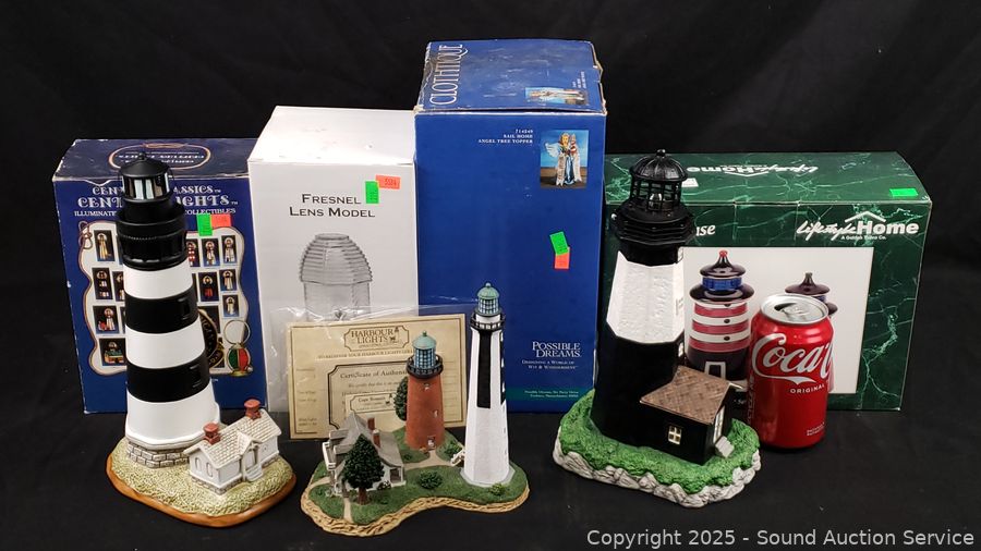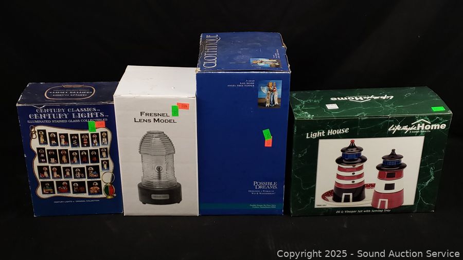 Harbour Lights Guardian of the Lights, Illuminated Stained Glass Collectible, Fresnel Lens Model, Harbour Lights Figure, Clothtique Angel Tree Topper, Lighthouse Oil & Vinegar Set. All in original packaging. Packaging may have some damage. Refer to photos for lot contents, more details.