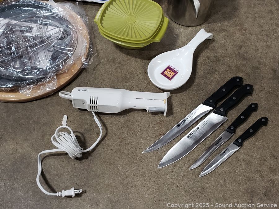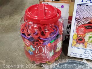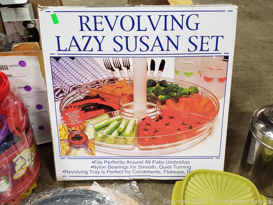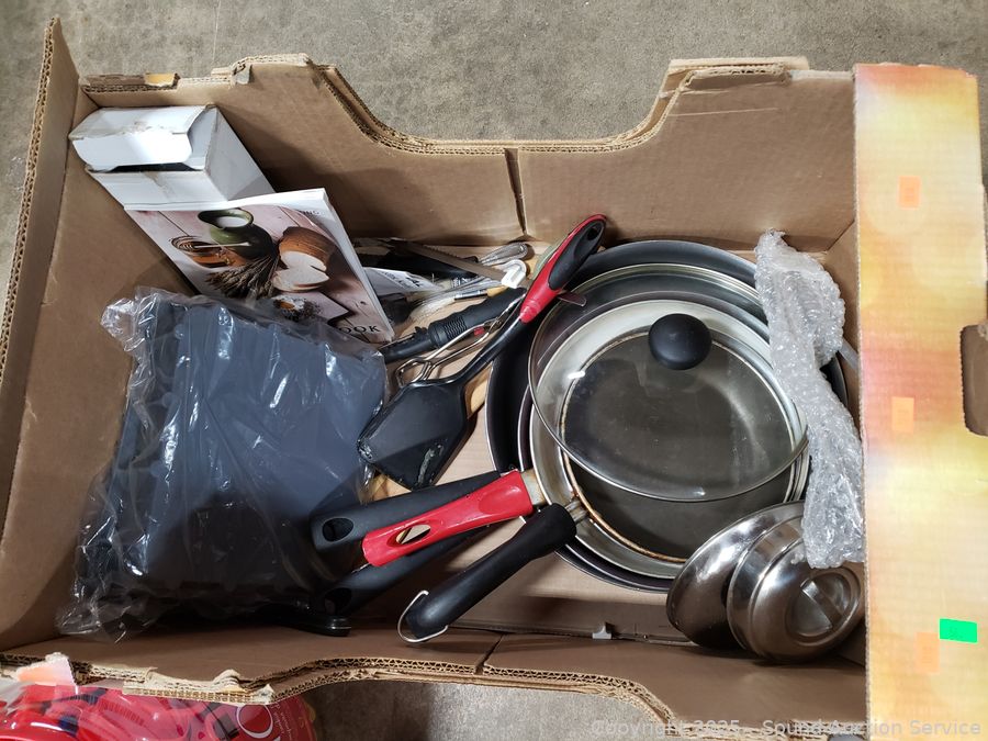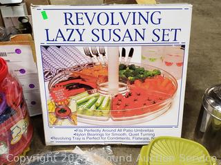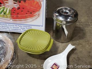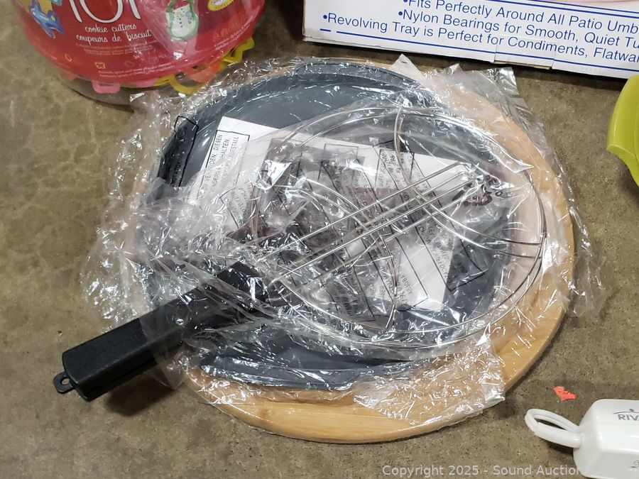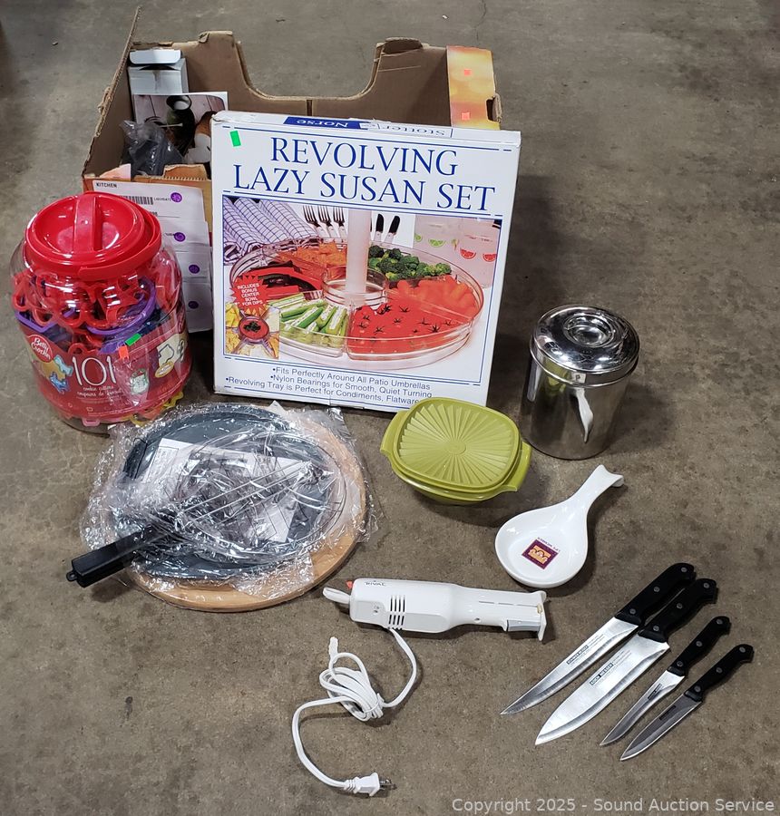 Lazy Susan, cookie cutter, cutlery, skillets, etc. Refer to photos for lot contents more details.