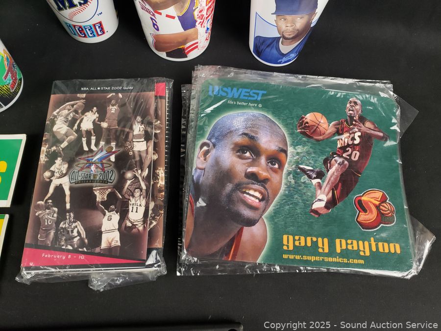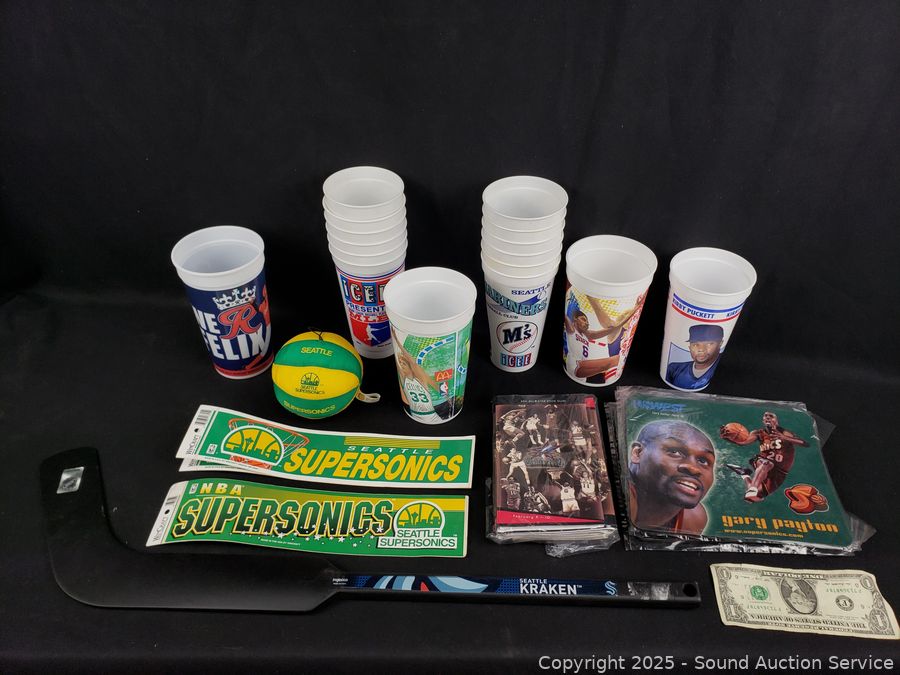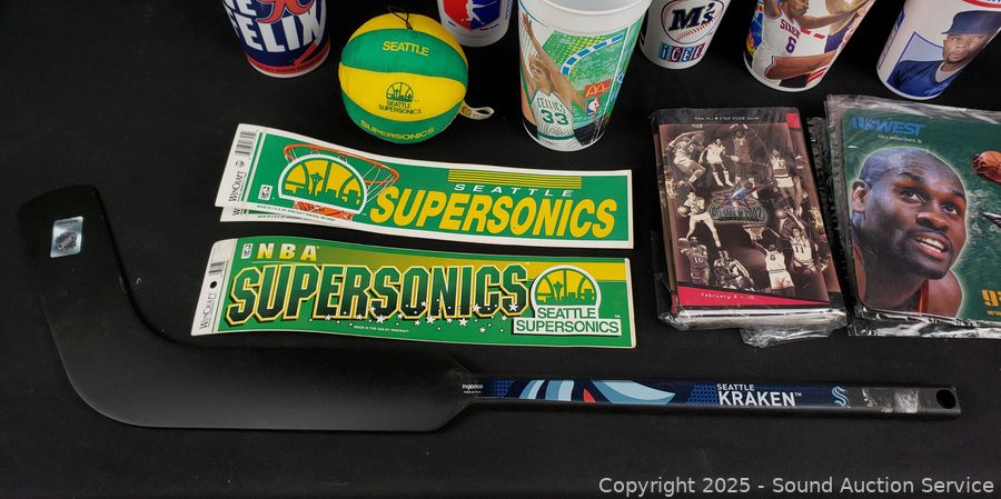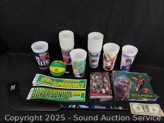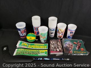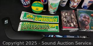 Cups, Seattle Kraken miniature hockey stick, Seattle Super Sonics bumper sticker, Conics mouse pads, etc. Refer to photos for lot contents, more details.