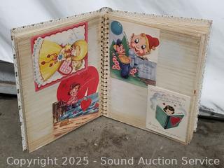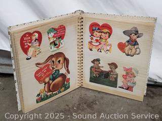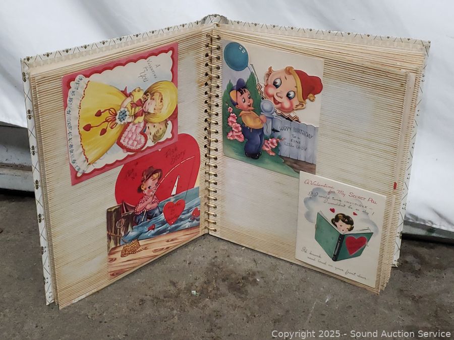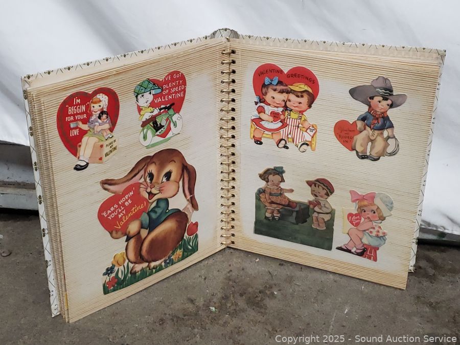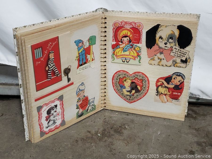 Scrapbook with vintage Valentines cards & ads, Hudson bug sprayer, wood block plane, hand massager, ebony carved bust figure, pocket knife, etc. Refer to photos for lot contents, more details.