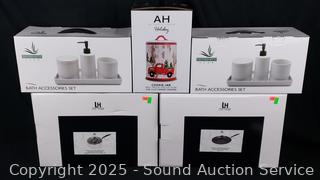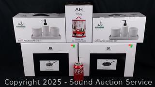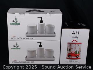 All appear to be new, unused. Lexi Home Skillet & Saucepan, Holiday Red Truck Cookie Jar, 2 Serenity Home Bath Accessories Kit.