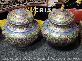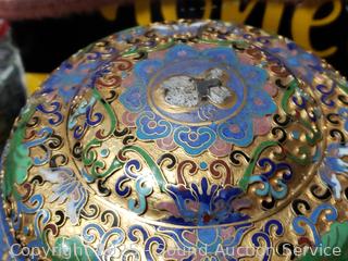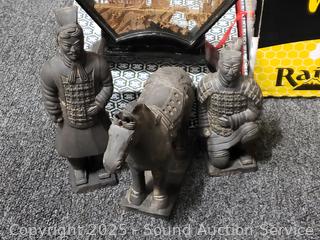 Large, cloisonne urns, silk nesting trinket boxes, cork art, terracotta warrior figures & more. Refer to photos for lot contents, more details.