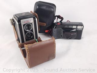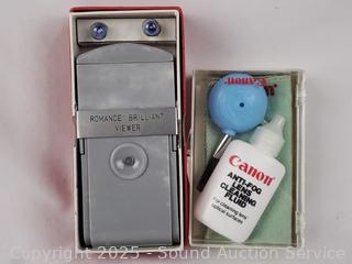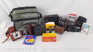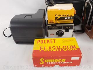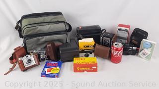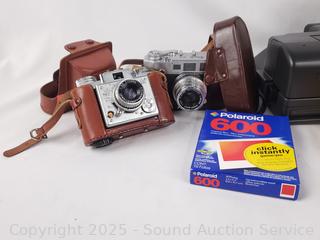 Samoca 35 III camera w/flash, Pax M4 Camera, Polaroid 600 Film camera, Canon 38mm camera, Brilliant Binocular Viewer, Kodak Duaflex II camera (case is deteriorating). Refer to photos for lot contents, more details.