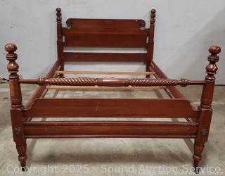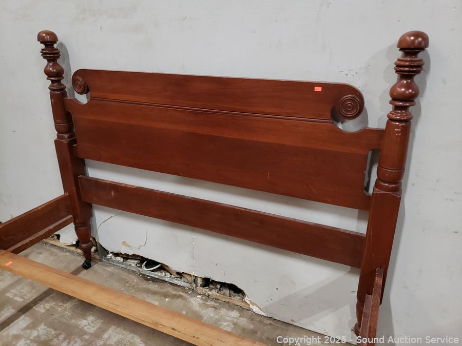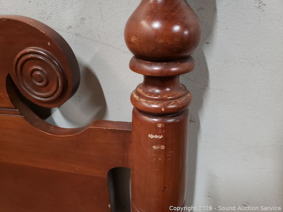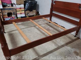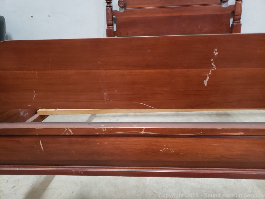 Some scuffed, scratches, wear to finish. Come with rails & slats. Approx. 40" to 46" H x 57" W x 76" long rails.