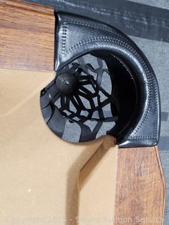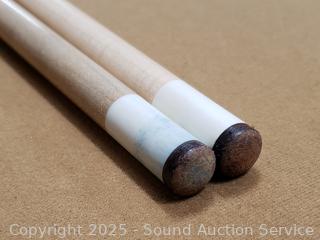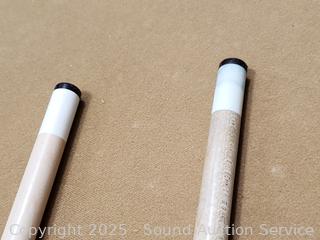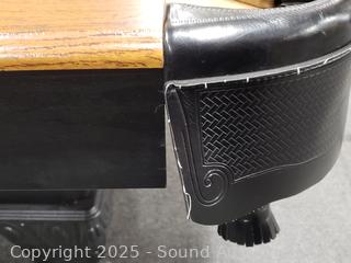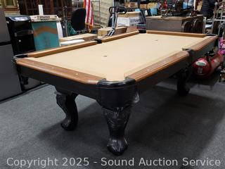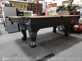 Smaller size. Oak trim, claw foot. 31" H x 48" x 87". Comes with collapsible brides, 2 Player sticks, 2 Racks, Claw, 2 Sets of Balls, Table Cleaner Spray, Rule Book, Chalk. Overall great condition. Sticks are very straight.