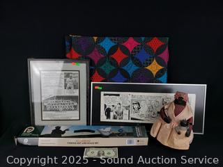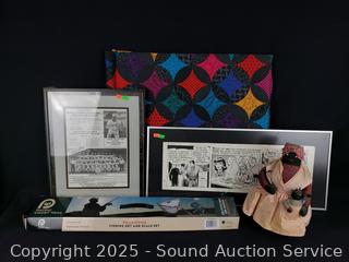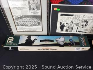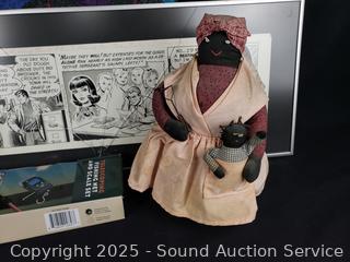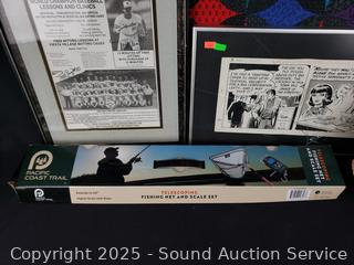 Aunt Jemima doll, telescoping fishing net & scale set, autographed Kerry Drake and Alfred Andriola framed comic strip (broken glass) , autographed Todd Cruz 1983 Baltimore Orioles team plaque. Refer to photos for lot contents, more details.