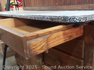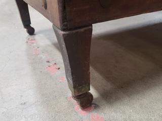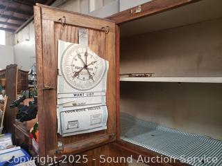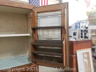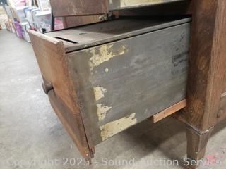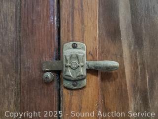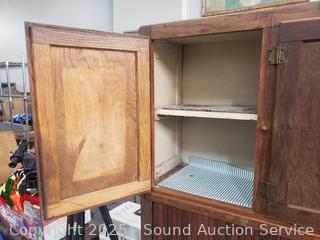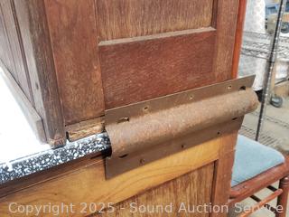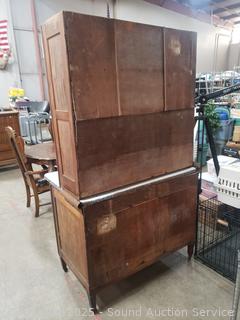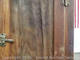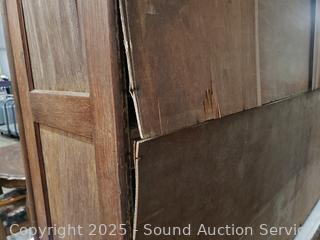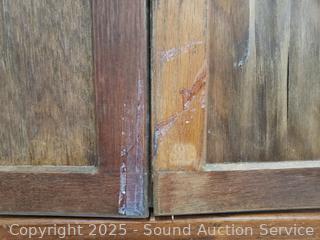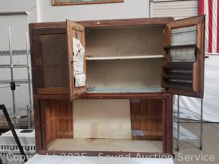 Various wear, some damage. Tambour doors do open, not the easiest to open, got to go back and forth a bit. One latch in top cabinet door is not latching, backing is damaged, coming off, some rust spots, scuffs in enamel. Steel casters. Approx. 72" H x 41" W x 27" D.