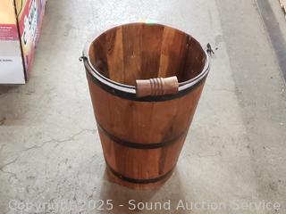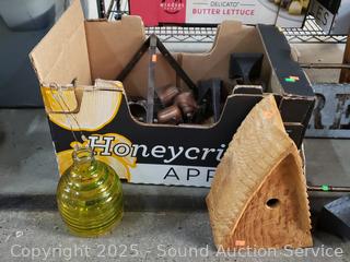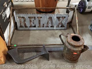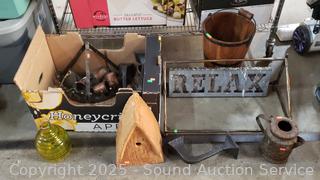 Wood bucket, tin Relax sign, metal sconce candleholders, carved wood birdhouse, glass beehive bottle, rustic pitcher, & pot. Refer to photos for lot contents, more details.