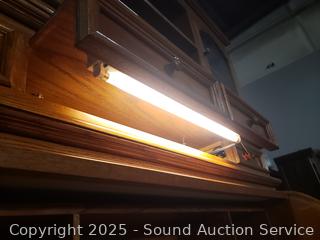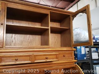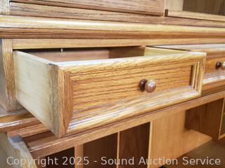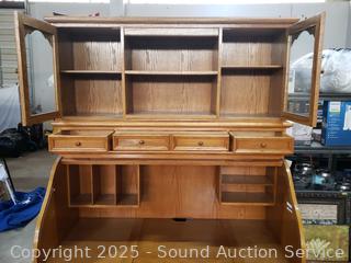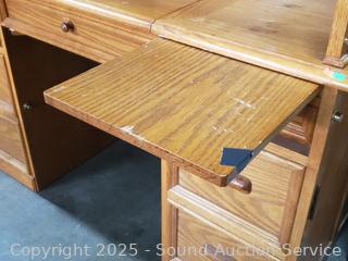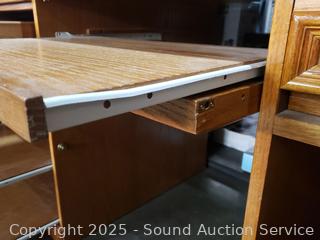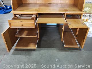 Pullout keyboard tray, tower cabinet, printer cabinets. Locking with keys. Bookcase topper with pullout light. Some scuffs, wear to finish, overall good condition. Overall 90" H x 63" W x 32.5" D.