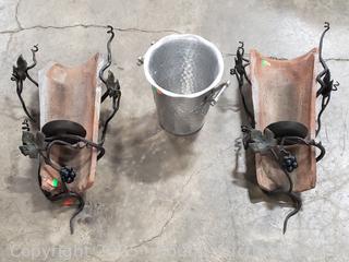 Lot #0106: Pair of Unique Wrought Iron Sconces & Aluminum Pail