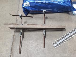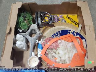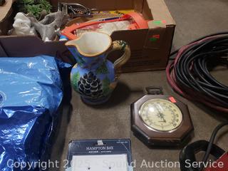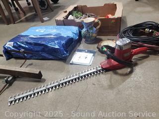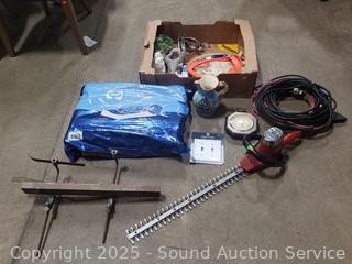 Elec. Craftsman hedge trimmer, stone bird bookends, weathered bone, pitcher, etc. Refer to photos for lot contents, more details.