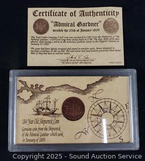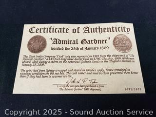 Genuine coin from the shipwreck of the Admiral Gardner which sunk in January 1809. Comes with COA. ATTN: We are not coin or currency experts or graders, please use your own judgement when bidding.
