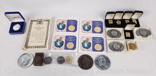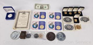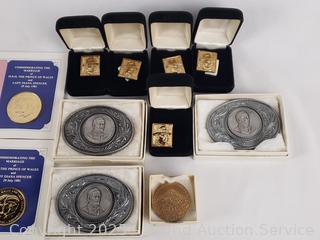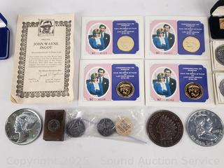 5 24kt Gold Plated John Wayne with COAs, 3 John Wayne Belt Buckles, Large Novelty US Coins, 4 Royal Wedding Medallions. Refer to photos for lot contents, more details.
