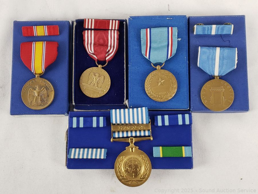 2 Good Conduct Medals, National Defense Medal, 2 Korean Service Medals. Chemical Protection Suit S:L. Blue jackets wear from use, chemical protection suit in great condition.