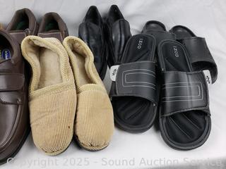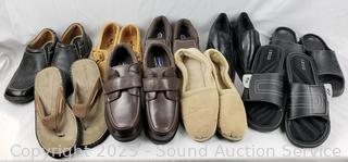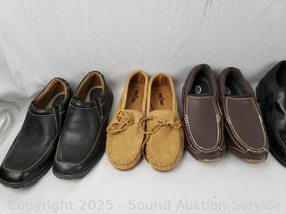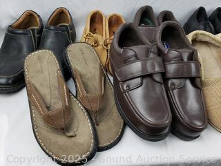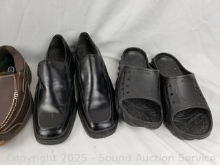 All have been worn, good condition. Izod sandals S13, MinneTonka leather loafers S:11, Dr. Scholls loafers S:11, Florsheim loafers S:11, Crocs sandals S:11 etc. Some duplicates.