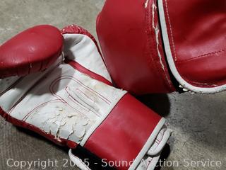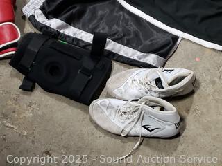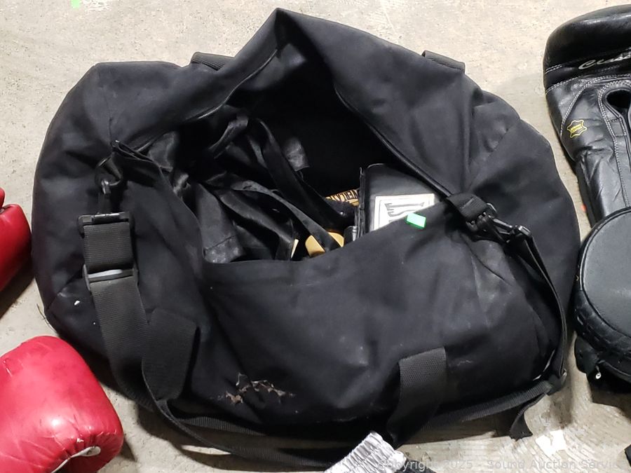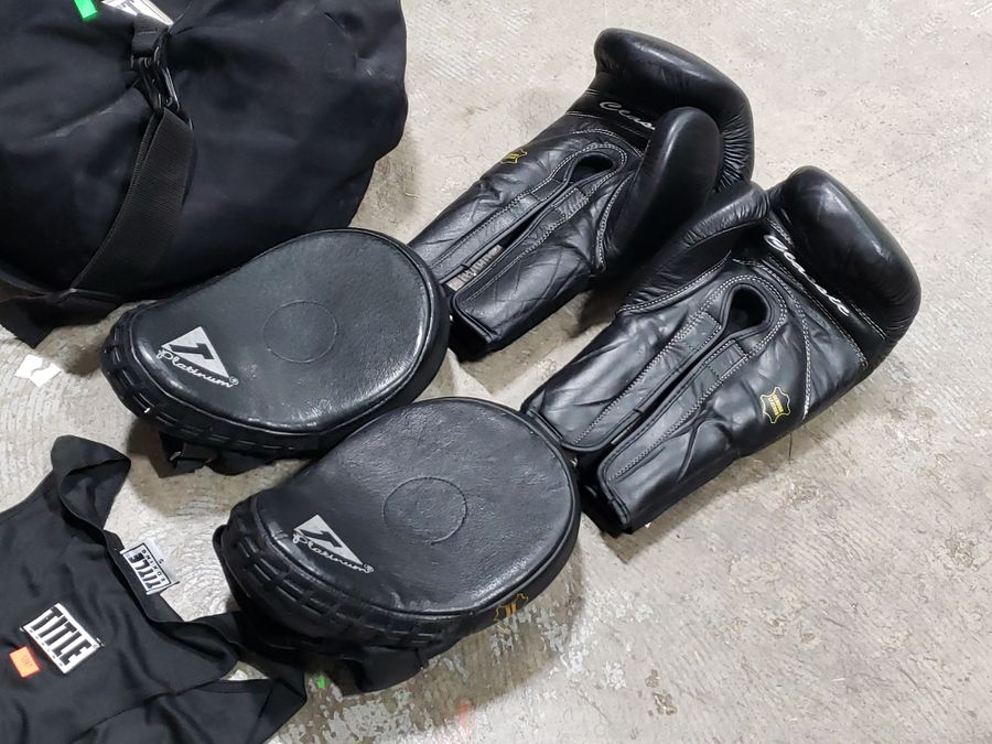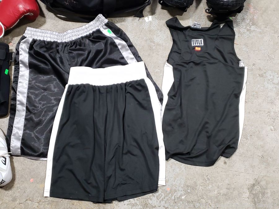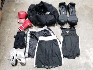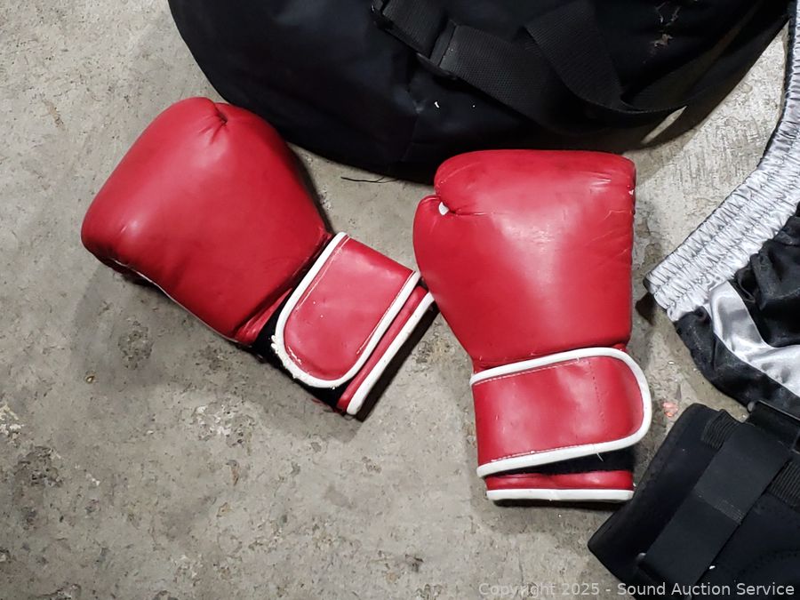 Robe, shorts, 12oz & 18oz boxing gloves (12oz are deteriorating), helmet, punching mitts, tank top, mouth guards (probably should boil, lol), footwear S:9.5, knee brace, athletic bag. Refer to photos for lot contents, more details.
