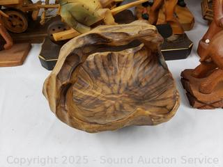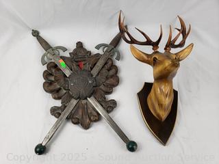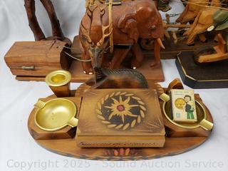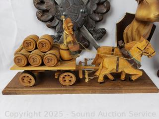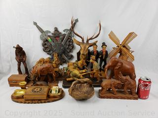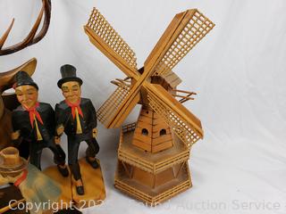 Lot #0247: Assorted Carved Wood Figures, Coat of Arms, Windmill