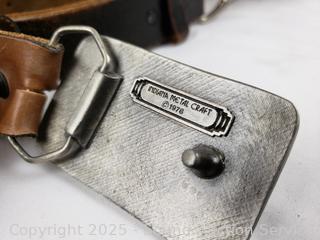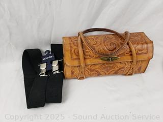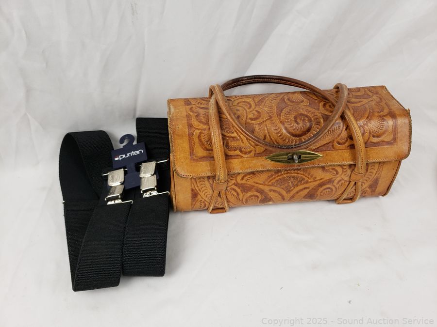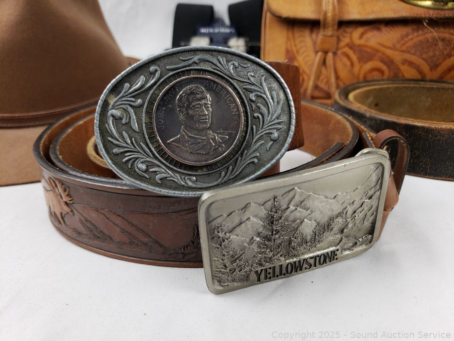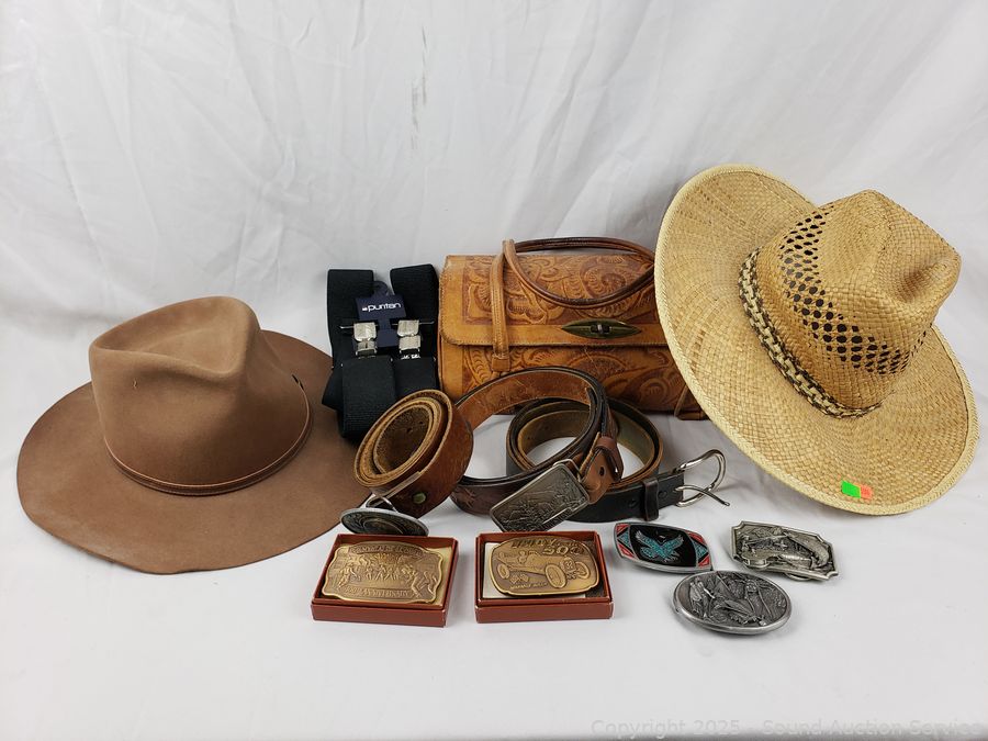 Lot #0176: Tooled Leather Bag, Brimmed Hats, Leather Belts, Buckles, Suspenders