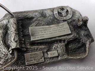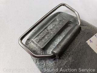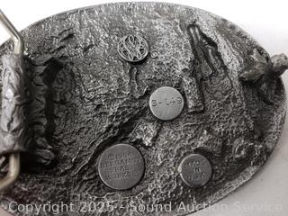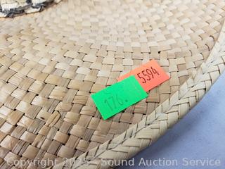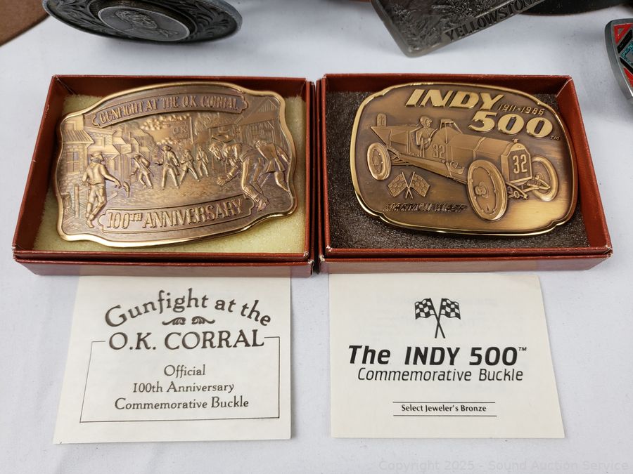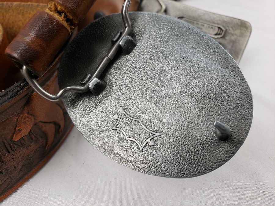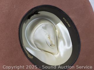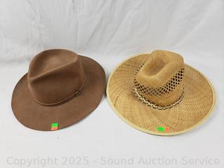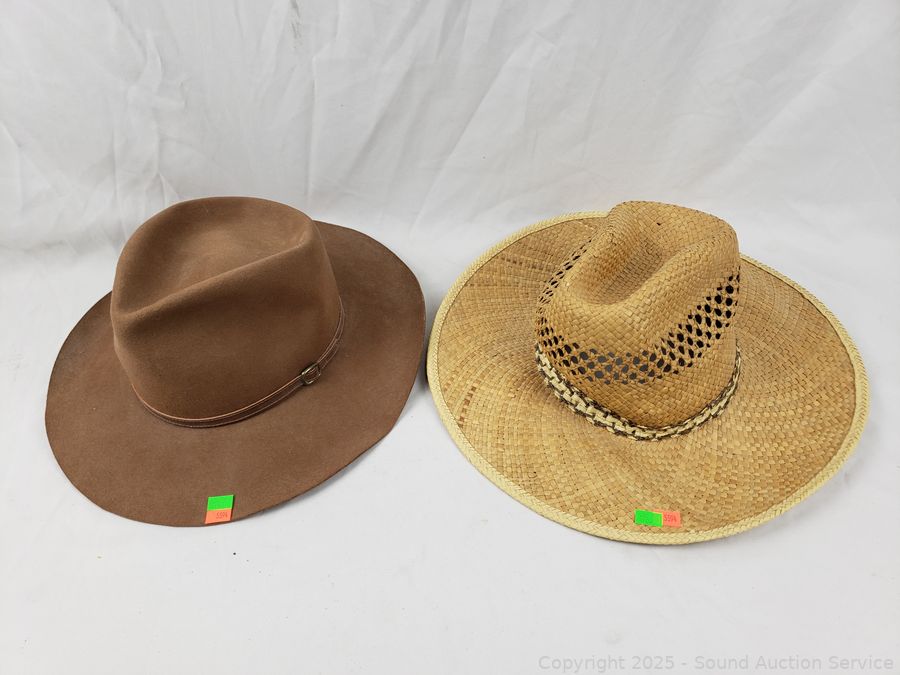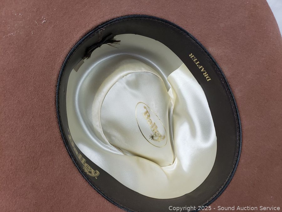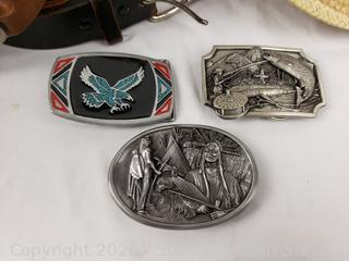 3 leather belts approx. 40". 7 belt buckles, tooled leather bag 12.5" x 6" x 5.5", Bailey felt brimmed hat, straw woven hat. Refer to photos for lot contents, more details.