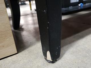 Approx. 30" H x 42" W x 14" D. Some scuffs, wear to finish. One leg damaged.