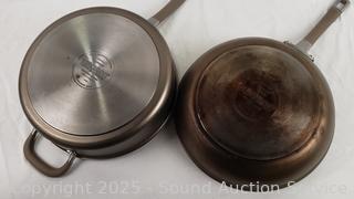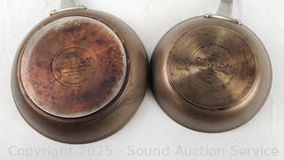 8.5", 10", 12" skillets, 12" frypans, 1qt, 2qt, 3qt saucepans. All have wear from use, need cleaned.