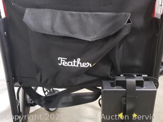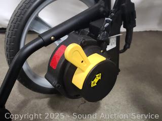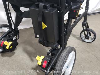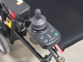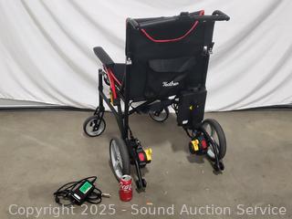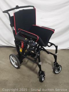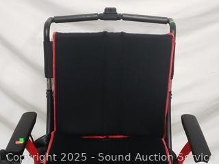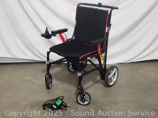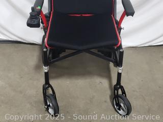 Appears to be functioning as intended. No footrests. In great condition. Folds up for easy movement, very light!