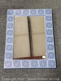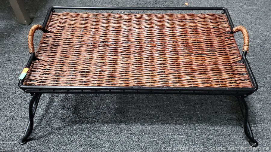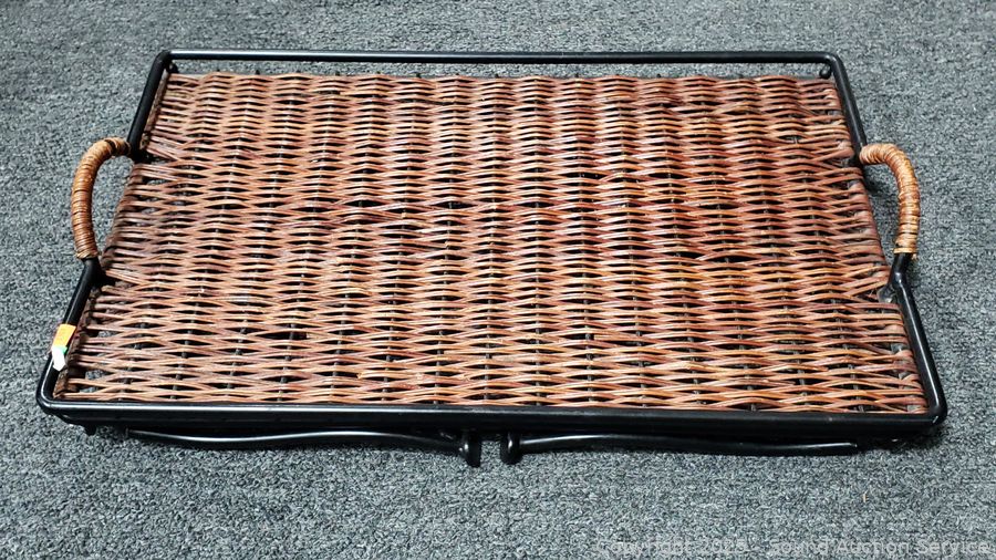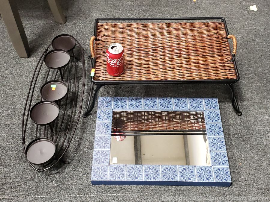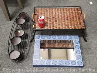 15" x 20" mirror. Wrought iron wicker wove lap tray. Candleholder holds up to 4" candles.