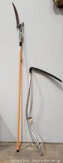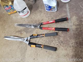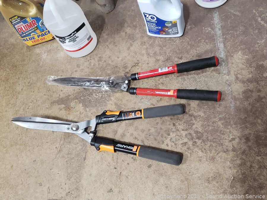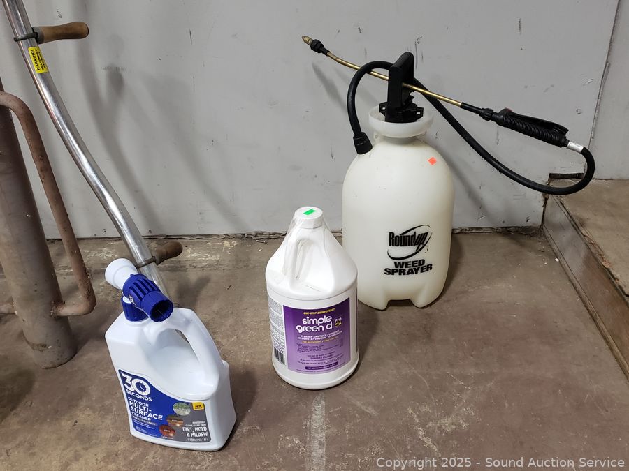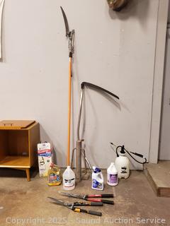 Pump sprayers, shears, 1 gallon simply green, 2pk sealed Liquid Plumber, Multi-surface cleaner, 1 gallon white mineral oil, scythe, fence post pounder, tree limber. Refer to photos for more details.