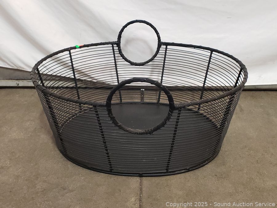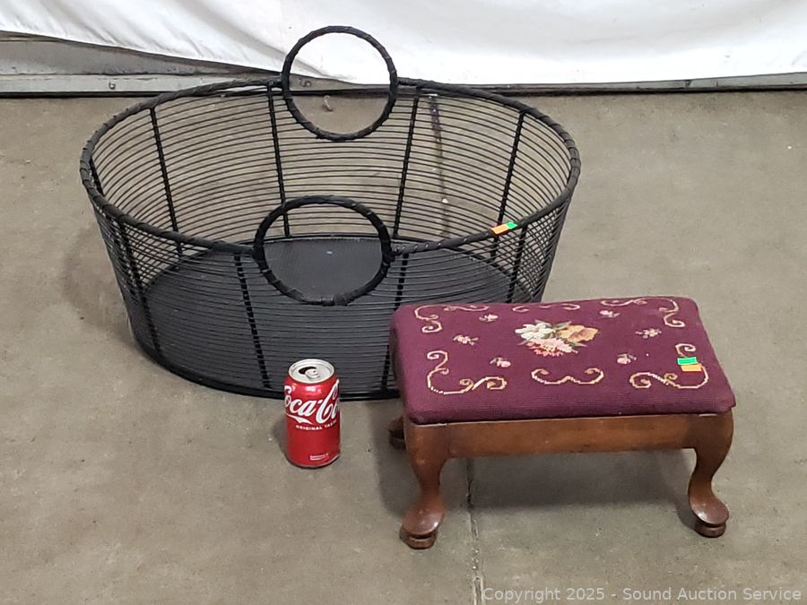 Lot #0023: Woven Metal Basket& Vintage Foot Stool