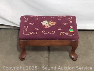 9.5" H x 25" x 22" basket, 8" H x 14" x 9" needlepoint stool.