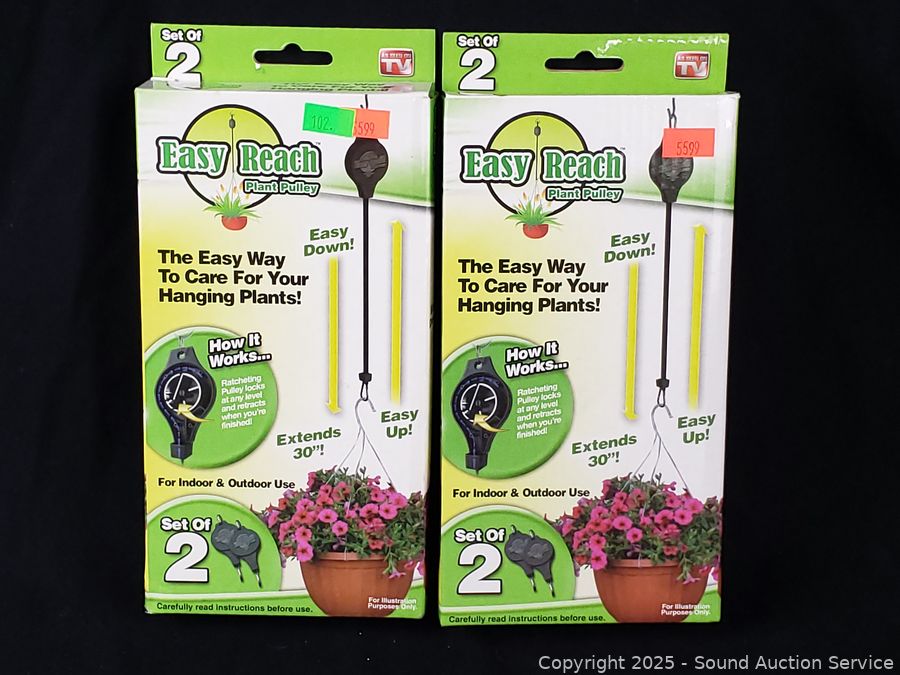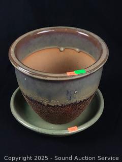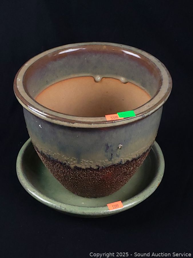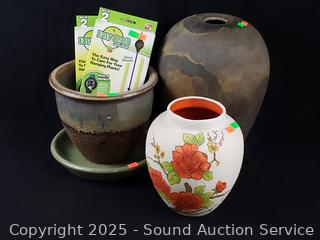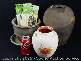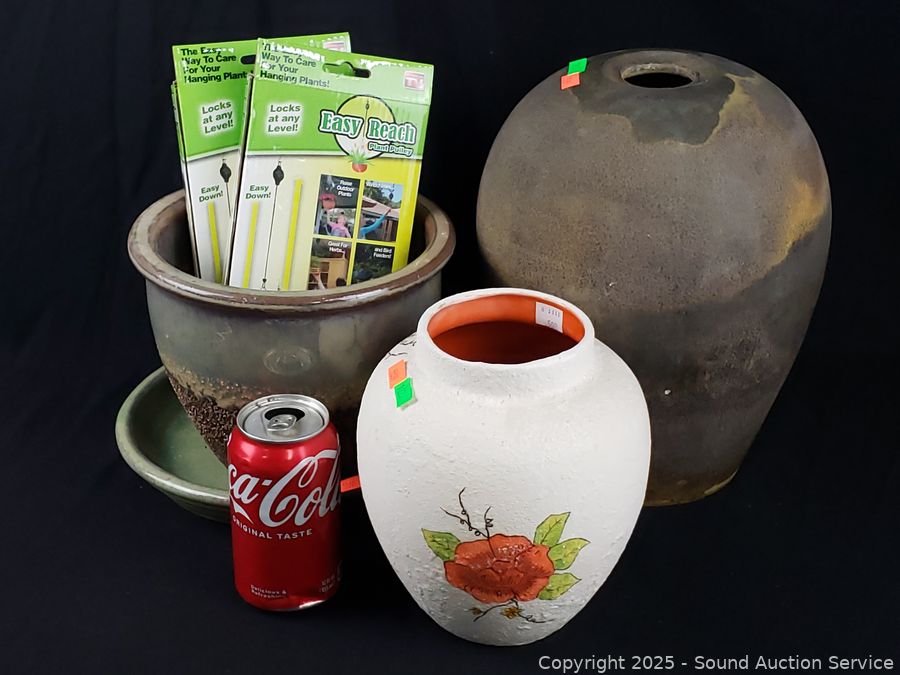 Lot #0102: 2 Pottery Vases, Planter Pot & Plant Pullies