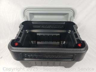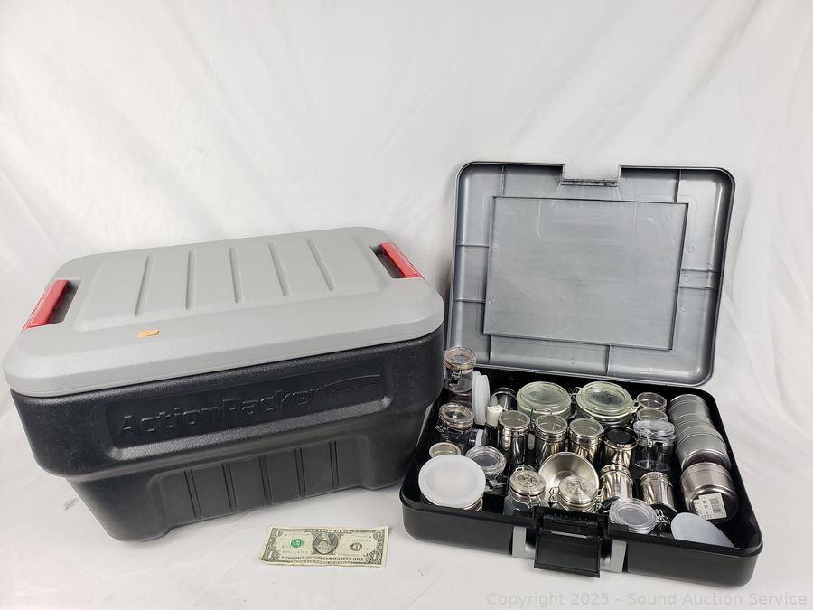 Approx. 1" to 3.25" Dia. Jars, 12" H x 20" x 14" Action Packer tote. Don't see any issues.