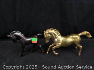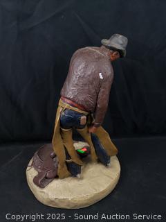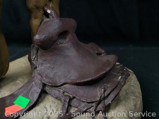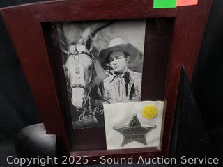Pottery cowboy sculpture (has damage on hat), 14.75" tall. Brass & bronze? horse figures, 4.5" to 7.5" tall. 4x6" picture frame & Roy Rogers photo w/badge.