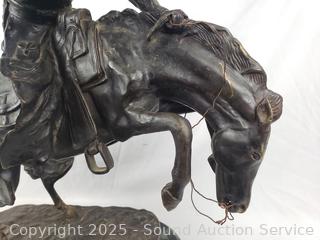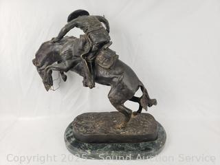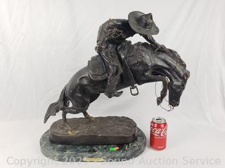 Signed Frederic Remington on the base. All bronze with marble stone base. Approx. 21.5" H x 21" x 10".