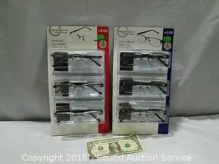 Includes (2) 3-packs, all come with coordinating cases. Includes: Full frame metal & Rimless classic.