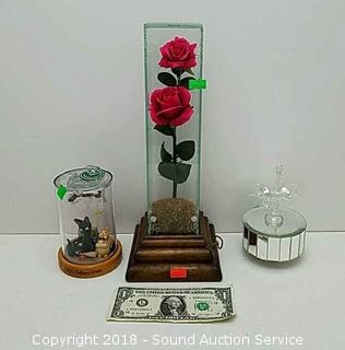 Includes: Glass encased rose, Dancing kitties, and art glass horse.