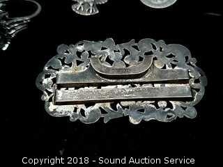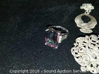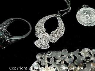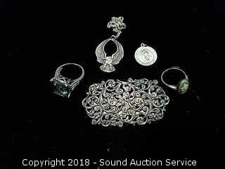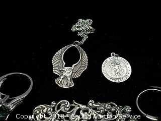 Includes: a mystic topaz and moisonite ring, size 7-1/4, a cameo ring size 6, eagle pendant with chain, filigree brooch, sterling scarf clip, and St. Christopher pendant. Total weight: 26.4 grams.