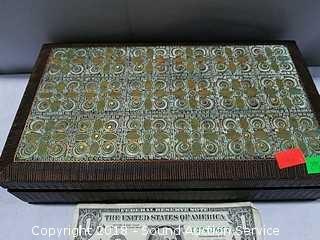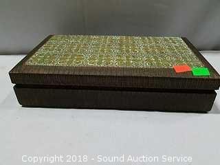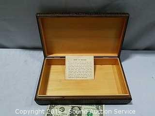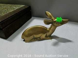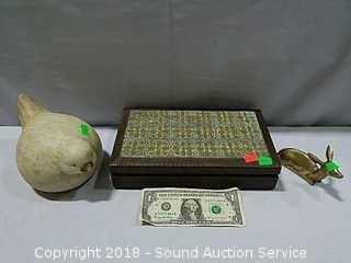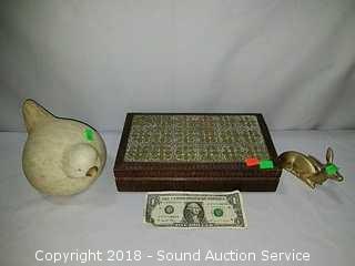 Trinket box is handcrafted, hand carved from Poland, with metal inlay, approx. 2-1/4" tall, 10-1/2" x 6". Bird figurine is signed "Walnut Creek California 2005", approx. 5" diameter. Also comes with a brass deer figurine.