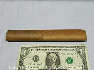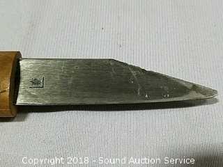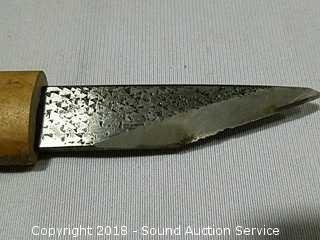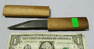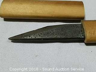 Has wooden handle and matching sheath. Some chips in the blade. Approx. 6-3/4" long overall.