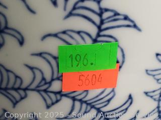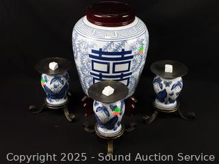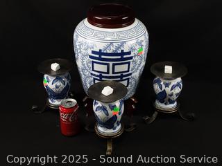 Lot #0196: Large Blue/White Porcelain Jug w/Lid & 3 Candleholders