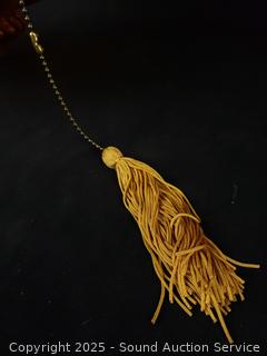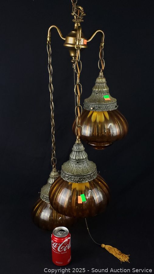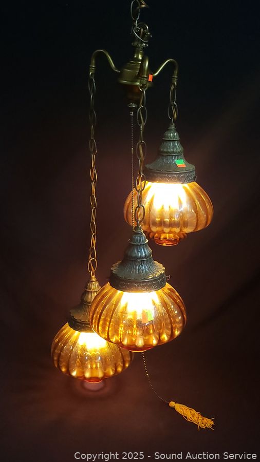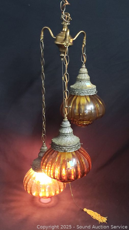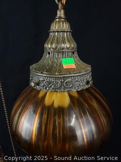 Marigold glass shades, appears to be functioning as intended. Approx. 30" length lamp, approx. 12ft length chain, cord.