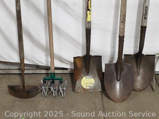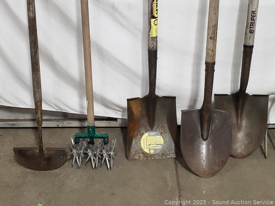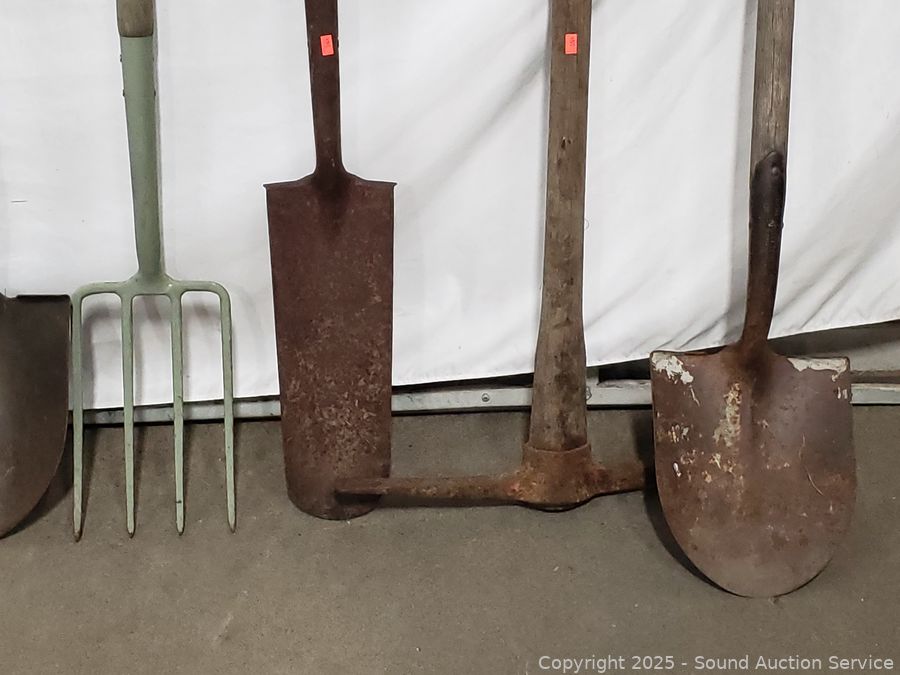 Mattock, spade & flat shovels, potato fork, etc. Signs of wear from use. Refer to photos for lot contents, more details.