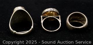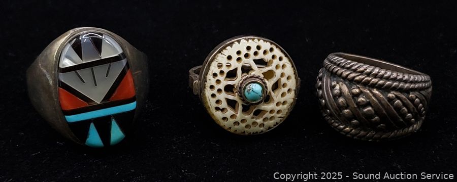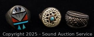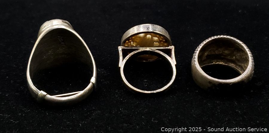 A few pieces are unmarked, all tested silver. Rings size 6.5-10, Bracelet 2.5" Dia. TW: 74.92g.