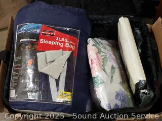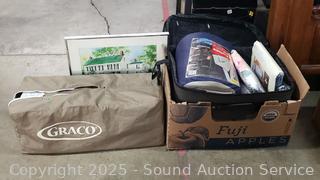 Graco pack & play pen, Diamond signed farm watercolor artwork, sleeping bag, suitcase, king & queen fitted sheets, etc. ATTN: All items are used, may be missing pieces, damaged, not functioning, complete, no issues, etc. All items as is. Refer to photos for more details.