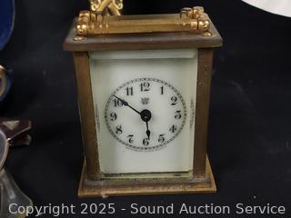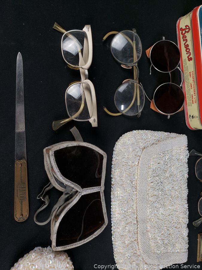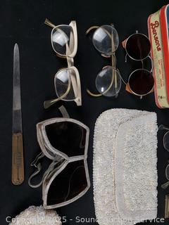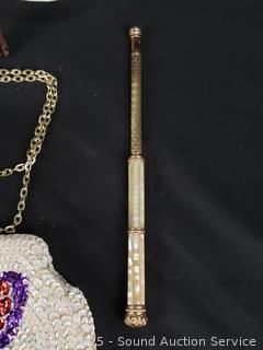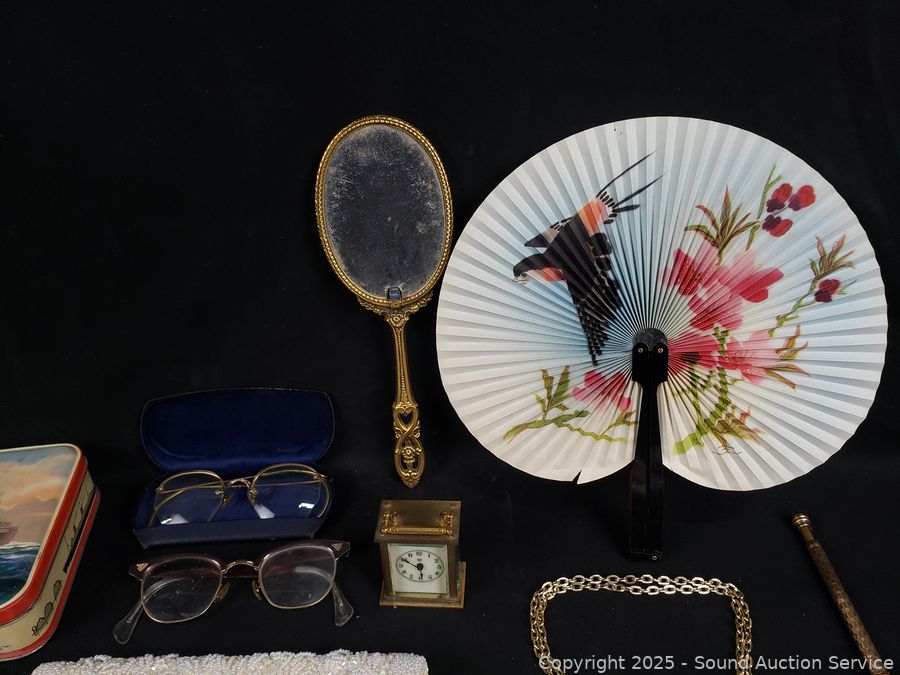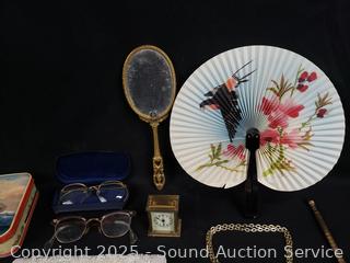 Small brass mechanical clock, wound tight, wants to run but stops immediately, 3 vintage beaded clutches, hand mirror (missing the mirror?), MOP telescopic handle for opera glasses, folding fan, vintage eyeglasses. Refer to photos for more details.