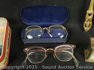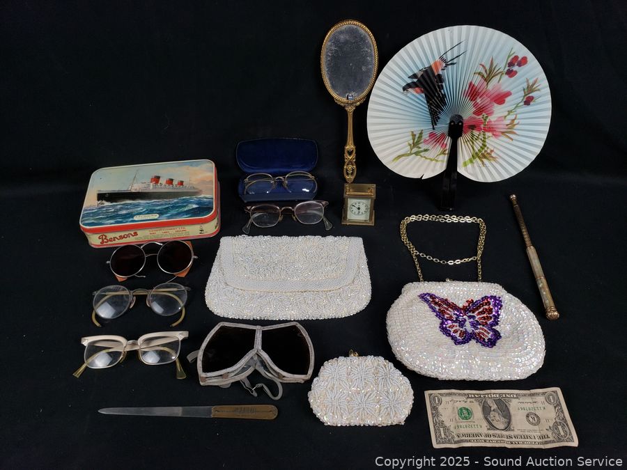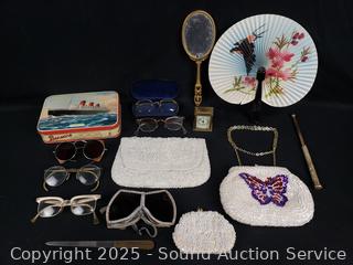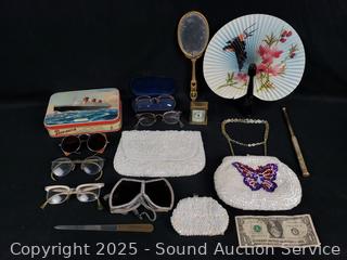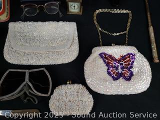 Lot #0228: Clutches, Eyeglasses, Clock, Hand Mirror, Etc.