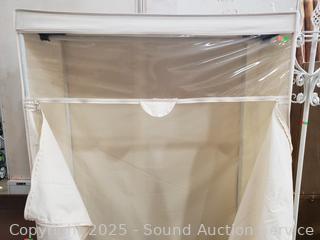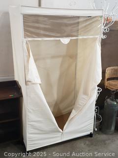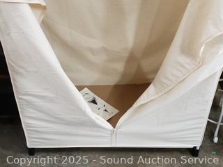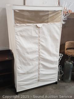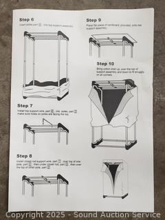 Has one clothes hanging rod. Don't see any issues, comes with assembly instructions. 63" H x 36" W x 19.5" D.