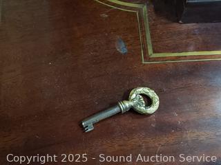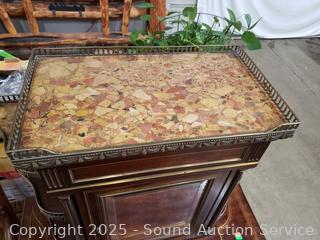 Mosaic Stone Top, inlaid has peeled up and bent in places. Beveled mirror, 5 drawers, skeleton key locks with key. Approx. 51" H x 31.25" W x 17.5" D.
