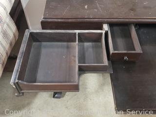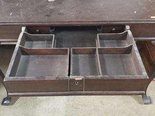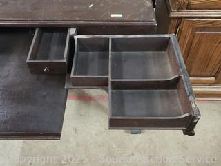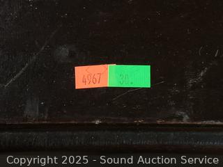 Dark finish, locking with key. 30" H x 43" x 26". Drawer is kind of unique, opens and spreads out. Various scuffs, wear to finish.